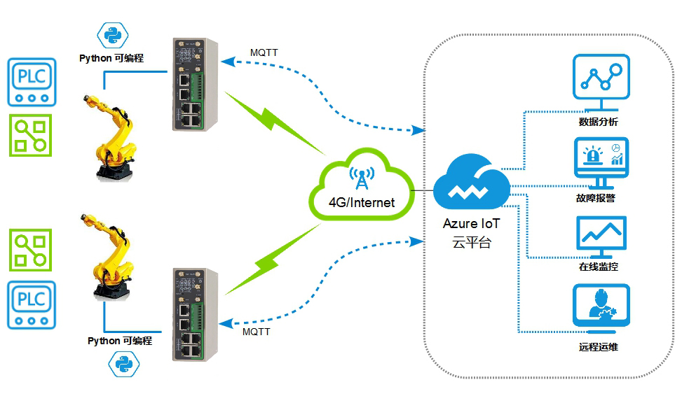 跃凡技术工业智能网关为工业机器人和云中心提供安全高速的数据连接,通过对机器人控制器进行数据采集,通过有线宽带,WiFi或者3G/4G等多种通信方式将数据传输至云平台,实现设备远程状态监控,实时告警通知和故障诊断分析,远程故障定位和程序升级,设备资产管理,设备预防性维护以及工业大数据挖掘等功能。