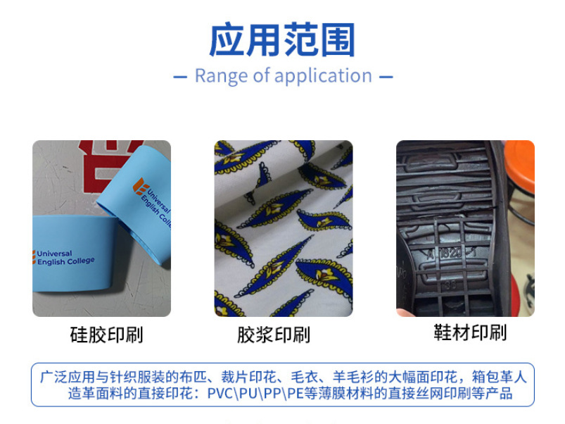 2.印刷范围:适用于服装、服装辅料、针织服装的布匹、裁片印花、鞋材、织带等大规模印花,替代人工印刷的德华自动印刷走台丝印机;箱包革人造革面料的直接印花:PVCPUPPPE等薄膜材料的直接丝网印刷。