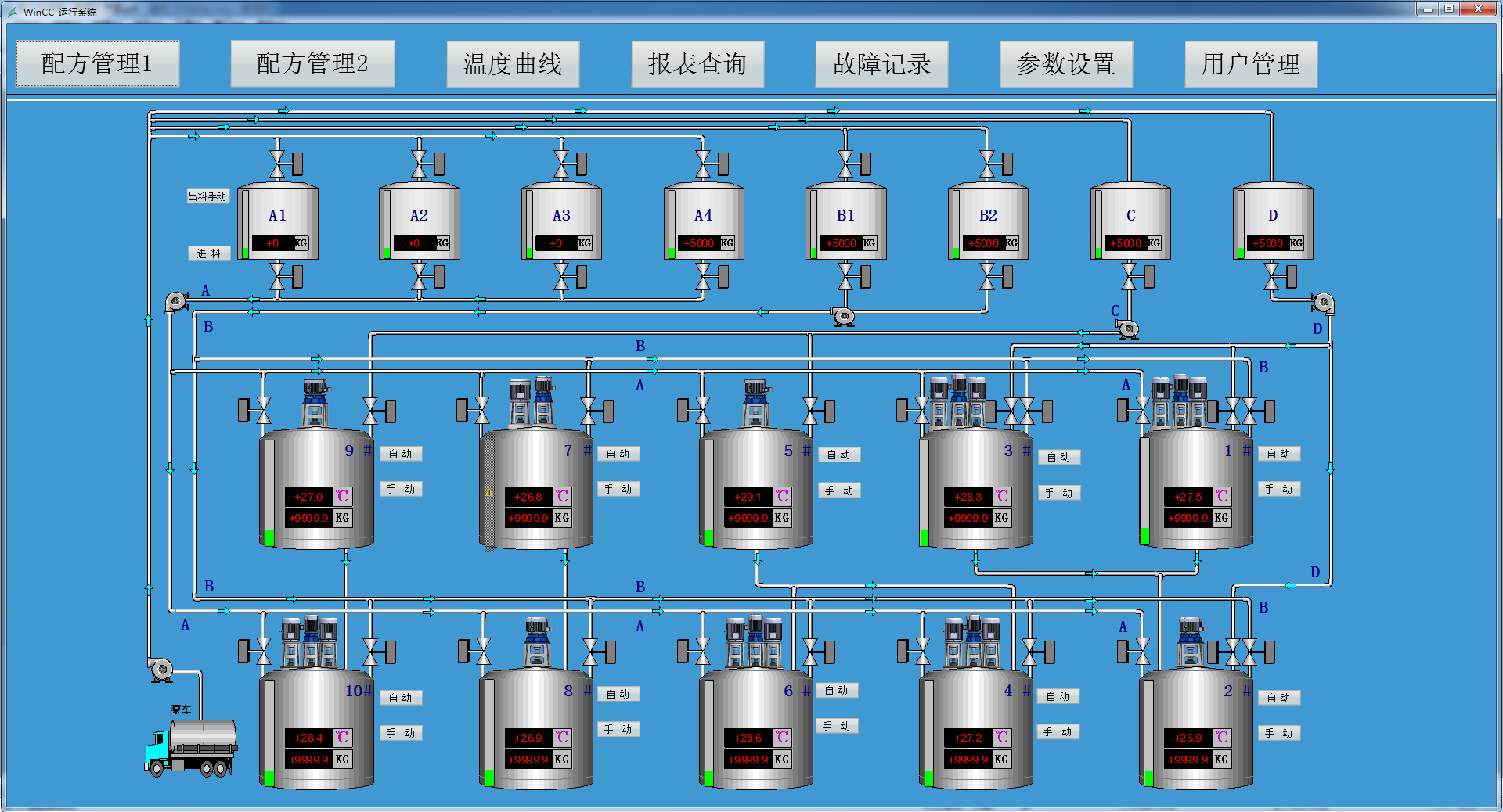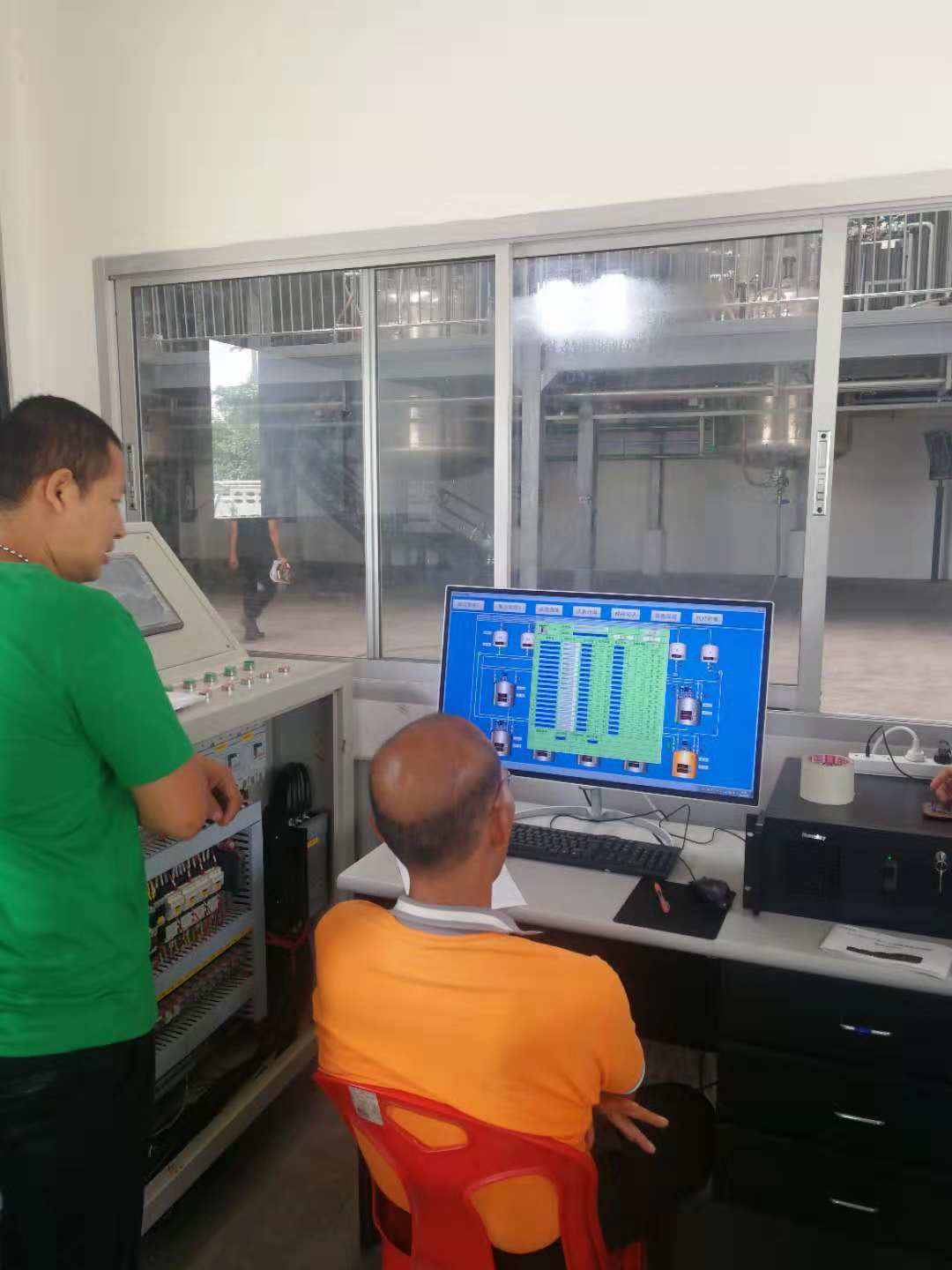 于2018年4月1日,我司在泰国北榄的ADB公司顺利完成胶水自动生产线的调试工作,本生产线可同时对10个反应釜进行不同配方高精度全自动配料,可大幅度提高生产效率,并采用全新的温度控制算法使反应釜物料温度控制精度在±1℃内。