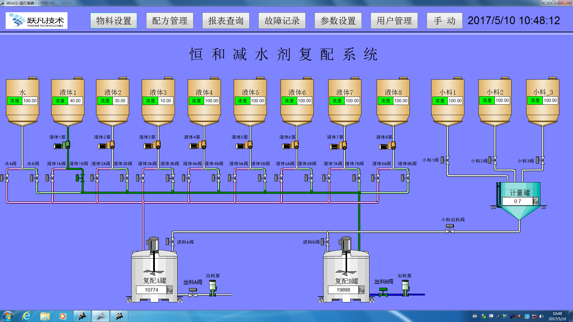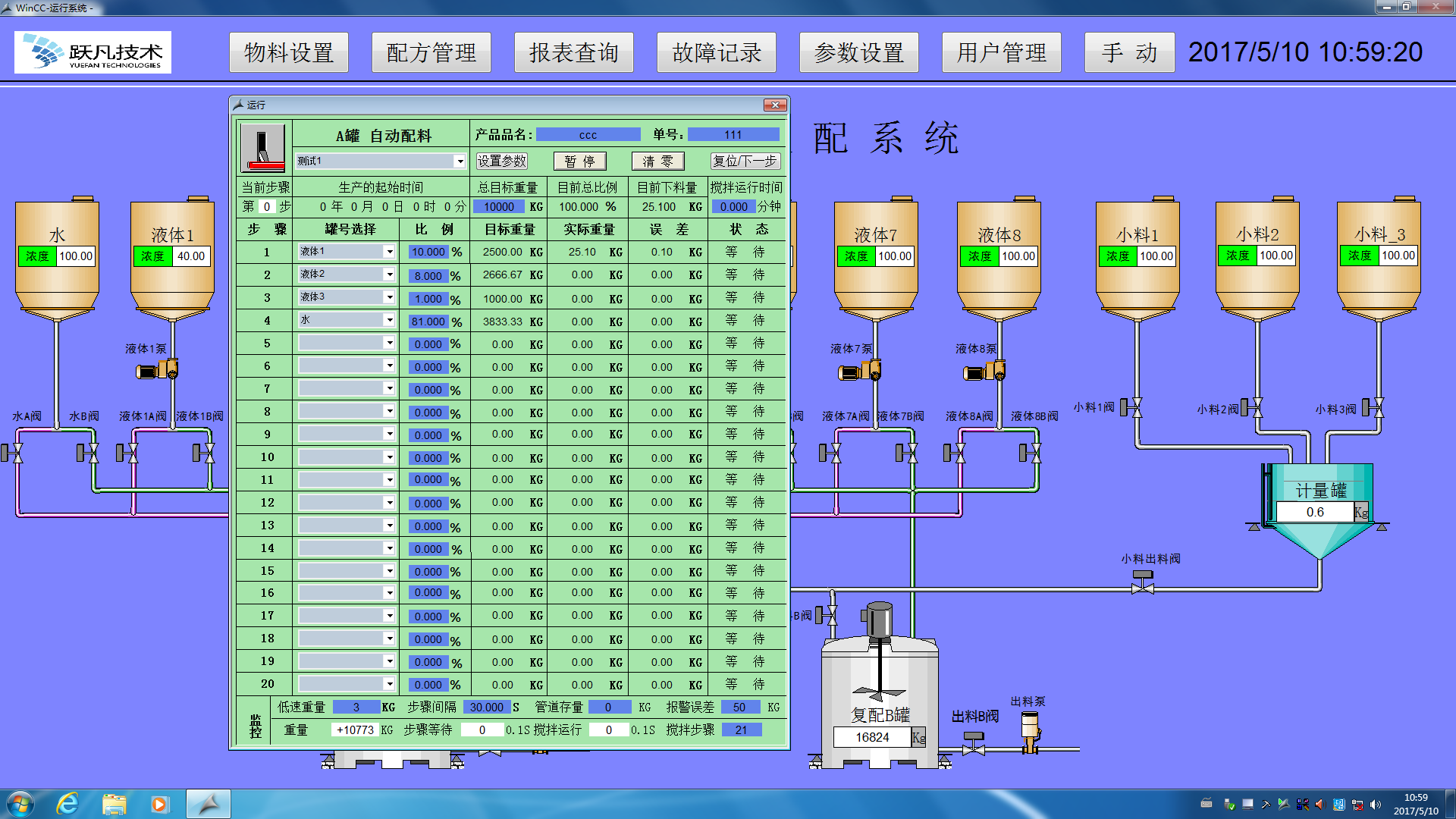 于2017年5月10日,我司在中山市南区的中山市恒和化工有限公司顺利完成自动配料系统的调试工作,目前系统运作正常,对20吨混合罐的配料控制精度达到了2公斤,400公斤小料计量罐的精度达到了100克(即2个计量称分度值),较大幅度的超出了客户对自动配料的精度要求。我司系统集成事业部在系统设计过程中,针对客户工艺,在原有配方管理的基础上还增加了依据浓度和配方比例自动计算固含量功能。