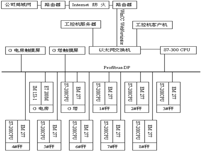 系统采用西门子PLC300,通过Profibus-DP通讯协议读取地坑皮带秤上的西门子PLC200、电房中西门子触摸屏控制的斗提机、辊筒等电柜控制信号,以及通过光纤采集到的高塔恒温控制系统信号,形成一整套完整的复合肥生产线控制系统,公司管理层还可以网络实时查看车间的运作情况。