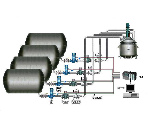 3、根据工艺模板所要求的总加料量、配方和加料时序;反应釜升温曲线等不同的控制特性,通过PLC的PID自适应控制反应釜冷却水回水电动调节阀,原料罐、氧化剂和还原剂的电动调节阀,实现反应釜全过程化学反应的智能化自动控制。