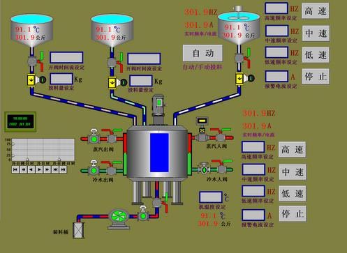 2、根据给料流量,结合反应釜及出口温度以及各种工艺条件,自动调节反应釜温度,并优化主要工艺参数的越界报警和处理功能。