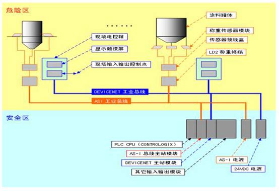 下图是跃凡技术在国内某知名涂料企业提供的涂料自动配料系统软硬件图: