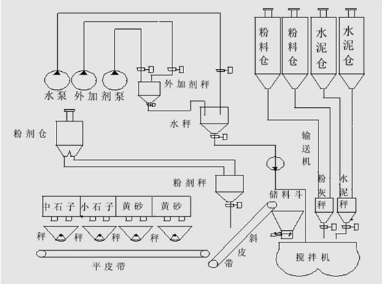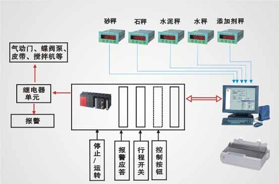该系统的控制功能如下:通过计算机可分别控制水泥、沙子、石头、水等各种材料的给定量,自行根据工艺流程确定上料的次序和搅拌时间。具有实时显示重量、实际下料重量;任意设定配方;手动和自动去皮重等功能,由于各路控制器之间相互联系,但又相对独立,在工作过程中,即使某路控制器发生故障,也不影响其他控制器的正常工作。