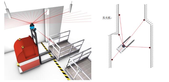 激光测量系统,能够在激光束的帮助下在一个平面内扫描周围轮廊,在一个二维极坐标下测量周围环境,当一束测量光束照射到物体,它的位置会以距离,方向和角度来确定,用从光发出到经反光板反射到激光传感器的传播时间可以计算出物体的距离。
