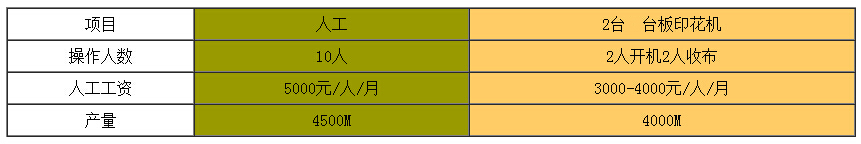 从上面这份表格中能看出人工工资高于机器操作工,人工产量与机器产量不相上下。但是随着目前印花行业的行情变化,刮板工的工资在不断的增长,不仅招工难而且对技术工人很难进行统一管理;所以这家公司的朱总在经历这些以后就一直很感谢我们把机器推荐给他,给他解决了生产大难题。现在准备上新产品的他,也准备再上两台我们公司的机器;据他介绍他的新产品印花尺寸要大,需要我们两台大尺寸的机器用于新产品的正常生产。